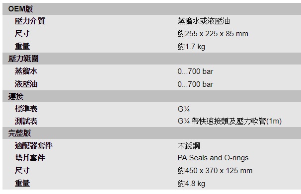 壓力介質: 蒸餾水/ 液壓油